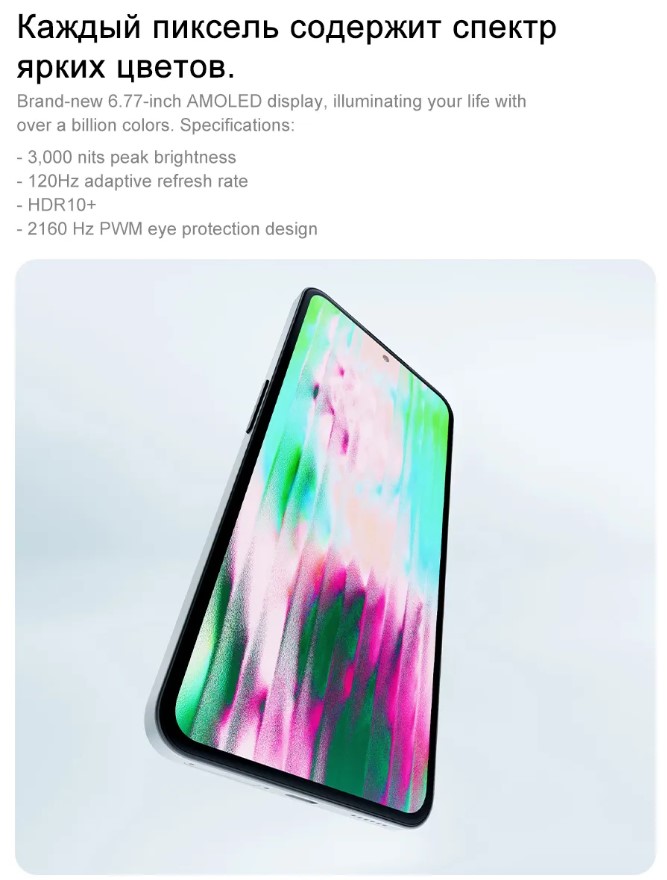 высококачественный 6.77-дюймовый AMOLED-экран разрешением FullHD+ с частотой обновления в 120 герц и пиковой яркостью в 3000 нит;